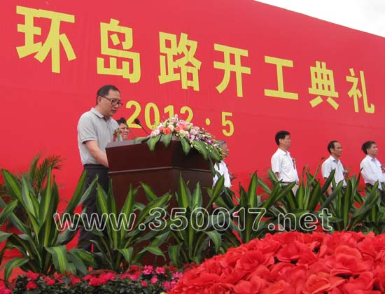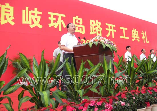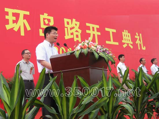 马尾区委常委、琅岐经济区党工委书记管委会主任蓝锋在开工仪式上介绍琅岐环岛路筹建情况