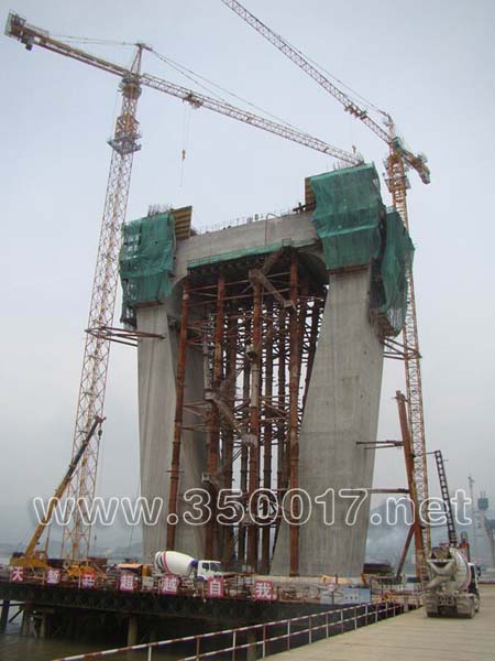 图为4号主塔墩中塔柱浇筑首节混凝土时的施工场景。