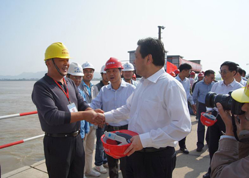 上午9时50分,杨岳一行在马尾区领导林飞、李利民、雷连鸣、高洪霖、杨木泽、游力、张麒蛰陪同下,一下车就走向等候在4号主塔墩平台的中大桥铁局琅岐闽江大桥Ⅱ标段项目部员工代表队伍,同项目经理李越生、工委书记郑庆华等一一亲切握手。