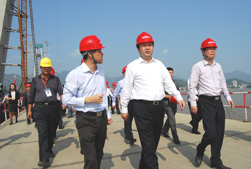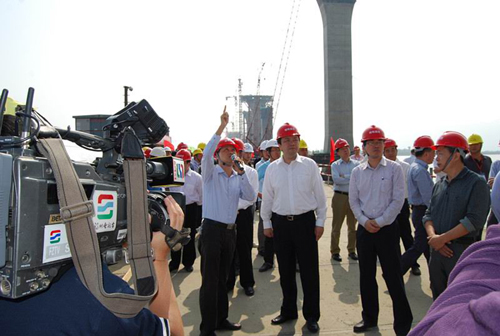 听完介绍后,杨岳一行抬头望去4号主塔墩塔柱正向200米大关冲刺,从水中主桥墩号块施工到琅岐侧岸上现浇梁工程呈现如火如荼、大干快干的景象,他强调指出:要全面推进“五大战役”,推动福州东南扩进,沿江向海发展,高起点、高标准、高水平、高质量、高速度把琅岐闽江大桥建设成为亭江--琅岐一道亮丽的景观和民生工程,以实际行动迎接党的十八大召开。
