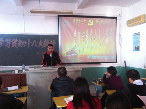 举世瞩目的中国共产党第十八次全国代表大会的胜利召开,海云中学全体教师备受鼓舞。连日来,学校采取多种形式开展“学习‘十八大’报告,落实科学发展观”主题教育活动,形成学报告、促发展、抓教学的浓厚氛围。学校采取上党课、学材料、利用电子屏收看、座谈讨论等形式学习十八大报告,加强党员干部教育,引导教师们一心一意抓教育,聚精会神搞教学,为全面建成小康社会多做贡献。与此同时,学校在全校范围内组织开展以“我看、我读、我写、我唱、我做”为主要内容的学习报告活动,以活动为载体,扩大学习面,以十八大精神武装教师队伍,提高教师素质,激发教师干劲。全校教师以各种方式认真学习、宣传十八大报告精神,怀着无比激动的心情描绘今后五年的蓝图,纷纷表示要以实际行动践行对党的忠诚,为全面建成小康社会建功立业。
