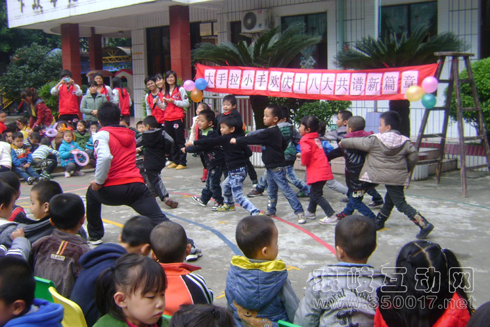2012年11月29日下午,孝先幼儿园张灯结彩,喜气洋洋,热闹非凡。是我园开展学习宣传贯彻党的十八大精神系列活动之——“大手拉小手,欢庆十八大,共谱新篇章”活动。回顾历史,中国共产党已经走过了九十多年的光辉历程。历史是一面镜子,照亮了现实,也照亮了未来。“十八大”又带给我们新的希望和期待。这是一个新的起点,也是一页崭新的白纸,等待我们用心去描绘。十八大”是朝气蓬勃的春天,期待着大家耕耘出灿烂的篇章。孩子是明天的太阳,祖国的未来。为了激励幼儿快乐学习健康成长,我园和农林大学东方学院计算机系12网络工程1班的学生们联手举办了本次活动。哥哥姐姐们精彩的载歌载舞、与小朋友的互动游戏,都给在场的师生们带来了阵阵的欢笑,赢得了连绵不断的掌声!哥哥姐姐还给孩子们鼓励,激励他们好好学习,长大也要念大学以及更高的学历也像哥哥姐姐一样把知识本领,爱与快乐传递给大家活动结束后,孩子们和哥哥姐姐们拍照留恋,依依不舍地道别。