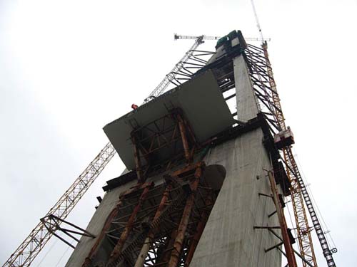 4#主塔墩自今年初浇筑首节段混凝土以来,中铁大桥局琅岐闽江大桥Ⅱ标段项目部树立“安全零事故,质量零缺陷,进度零滞后,成本零突破,环保零投诉”的工程管理目标,超前运作,科学施工。在施工中运用了一系列国内最先进的施工工艺和技术,采用最先进的液压爬模系统,快速推进,昼夜施工。