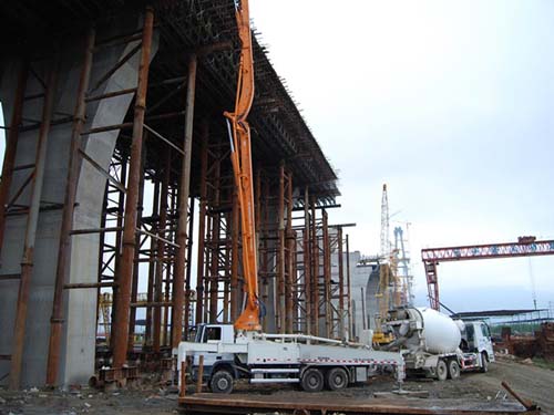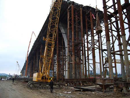 2013新年新气象,笔者走在琅岐闽江大桥Ⅱ标段琅岐环岛路互通匝道工地上,各类履带吊、轮式吊、龙门吊机、打桩机、挖机、悬挖机、平板运输车、装载机车机声隆隆轰鸣、搅拌车来回穿梭、混凝土泵车不停的向着互通匝道主线桥Z16—Z19现浇梁顶板泵送着混凝土料,顶着凛冽的寒风,几位工人手持振动泵不停的振捣着,数位工程技术人员和监理在一旁指导相关工作,建设者们以大干的热忱迎接新年的来临。据施工现场负责人何万虎介绍:目前己投入机械设备20多台(套),人员200多人,昼夜施工两班倒,主线桥已剩下两联6跨进入了施工攻坚阶段,互通A、B、C、D匝道的承台、墩身和现浇梁支架正抓紧施工。