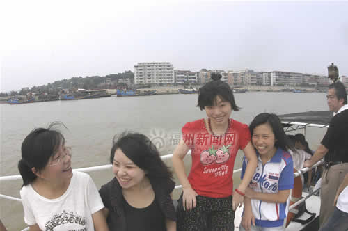 暑季的周末,前往连江县琯头镇壶江岛的轮渡总是十分拥挤,船上的客人个个打扮得十分时髦,他们多是以家庭为单位,但大部分并非游客,而是长期居住在福州和连江城里的岛上居民,利用暑假或周末带着孩子回老家度假。20分钟时间,轮渡穿出闽江口上两只龟状岛屿,不久就到达了壶江岛,一进岛首先得穿过近20米的高大门楼,两旁是绿色如荫的园林和公园,公园连接着环岛水泥大马路,再往里是一片现代城市建筑林立在眼前。