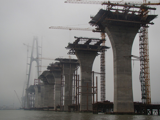 琅岐侧水中引桥上部结构采用挂篮现浇施工,该0#节段梁位于水中引桥S4号墩,其结构为单箱双室斜腹板结构,整幅布置,顶宽25.5米,底宽13.5米,高度3.5米,钢筋用量50吨。经过参建人员连续16个小时的艰苦奋战,于15时33分顺利浇筑完工。共浇筑混凝土338.3立方米。