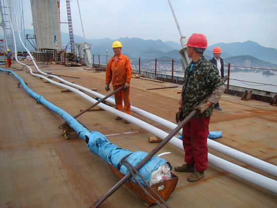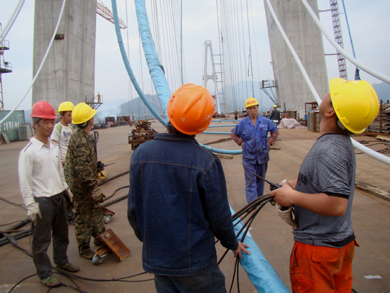琅岐闽江大桥分Ⅰ、Ⅱ两个标段施工。昨天,记者在琅岐闽江大桥闽江南、北两岸采访,在全长8公里多的施工线上,只见巍巍3#、4#主塔墩巍然高耸云端,巨大的吊车伸长巨臂,把各种建筑材料准确运送到位。在大桥钢箱梁工作面上,焊花闪烁,机声轰鸣,工人们正紧张环缝焊接,吊装斜拉索,一派紧张施工的场面。