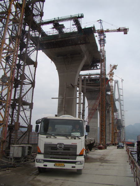记者在现场看到,南岸Ⅱ标段水上挂篮施工如火如荼,S5号墩前台多辆搅拌车往返不停地经过地泵向第3个节段梁输送着混凝土;北岸Ⅰ标段引桥现浇梁施工热火朝天,满辅钢管支架不断向前推进;两岸多台塔吊、履带吊、车轮吊机臂杆高耸云天,运转频繁,不间断为水上和岸上引桥现浇梁吊装钢筋或模板等材料;南岸Ⅱ标段互通立交匝道上,A11—A17号墩45米满辅支架的现场,哨声不断,钢管支架向前辅开。工地上各类机械马达轰鸣,装载机、挖土机、履带吊机机声隆隆,奏出那美妙的施工交响曲如劳动者在引亢高歌;10多台平板运输车、轮式吊机车、搅拌车来回穿梭,两台天泵伸着长臂不间断的向防撞墙、墩身、现浇梁泵送着混凝土,恰似一股浩浩荡荡的闽江大潮在波动。从开工至今,全桥共计浇筑完成混凝土330000立方米,约占工程总方量的78.6%。