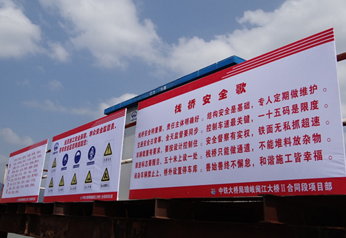 一是建桥国家队有形化。以品牌形象为重点,精心打造“大桥局”品牌形象。按照公司总体要求,从整体上搞好工地形象建设。工地门楼、旗台、企业宣传牌、彩旗、安全(环境)警示牌、责任牌、工程标志牌、项目牌、工程简介等一应俱全。 “中国中铁大桥局承建”9个三米见方的大字耸立在4#墩平台面向闽江水中心、钢筋车间等生产区和驻地生活区树起了以篮色为基调的企业理念和企业精神等塑形标识、标志、标牌。统一员工和民工的防护用品和安全帽,项目部及工区大院旗台制作标准、规范;具有本部特点的“栈桥歌”和“群安员--三字经”、党群组织温馨提示安全警示牌及整装镜、栈桥安全规程牌在780米长的栈桥头格外醒目。在琅岐岛广阔的田野上突显出中铁大桥局的国企形象。