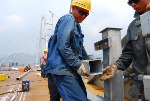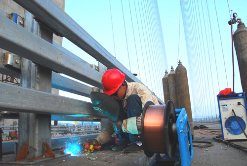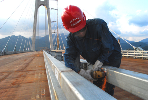 琅岐闽江大桥主桥今年6月中旬合龙后,参建单位立即组织专业人员进场,迅速展开主桥防撞和检修护栏的施工。逢时榕城七、八月,骄阳似火,烈日炎炎。最高气温达43.1℃(气温41℃,中央气象台早间预报),灼人的热浪一波波地侵袭着在主桥安装防撞护栏的作业人员,脚底钢梁面上温度达50.6℃。面对迅速飙升的高温,施工单位采取多项有效措施,制定了合理的施工作息时间,采取“做两头、歇中间”的方法,早上六点到上午十点,下午三点到晚上八点,既保证工程总体施工进度,又避开中午高温作业时段,减少酷暑天气对施工人员及设备造成不利影响;同时,严格按照现场标准化和施工精细化的要求,精益求精,安全、优质地确保整个防撞和检修护栏快速地向前推进。