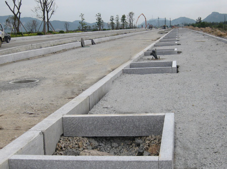 按照合理施工安排,道路分左右两幅进行施工。现在右幅道路已经完成稳定层混凝土铺设,道路功能(标准三车道、非机动车道、人行道,以及相应之隔离带)定界砌石,道路雏形与规模已经显现,部分路段开始浇筑沥青路面。