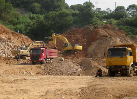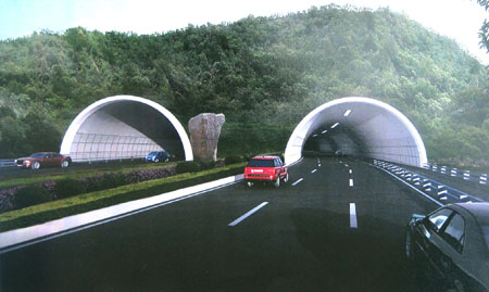 环岛路二期工程向东北沿九龙山北麓布线,设隧道往东穿越烟台山(又名金牌山),经凤窝村北面,沿闽江岸边布线。目前隧道开挖正进行前期施工,许多挖土机与大型车辆在紧张操作,隧道洞口已经显现。