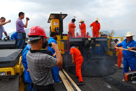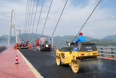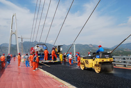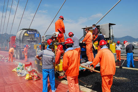 自10月中旬进行主桥钢桥面沥青辅装以来,参建单位(山东路桥公司)抓住“黄金施工”期,抢时间、争进度。在建设单位和监理单位的指导下,严把工程质量关,整个施工过程有条不紊。沥青出场温度、到场温度、摊铺温度、初压温度、复压温度、终压温度等相关指数均控制在设计范围内。经过7天的奋战,顺利完成了大桥钢桥面左幅的底层摊铺施工,辅装长度1280米,用料1320吨。