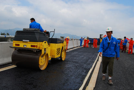 目前,参建单位正争分夺秒铺筑钢桥面右幅沥青混凝土,全力向着年底建成通车的目标奋力冲剌。