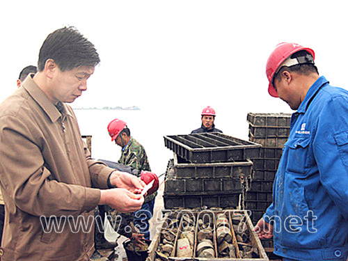2010年5月7日交通部门勘探船在琅岐岸边作业,高洪霖登船察观看江底岩心取样。