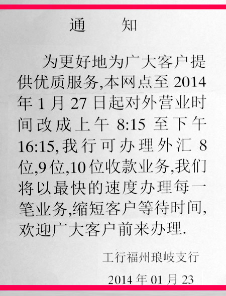 中国工商银行是中国五大银行之首,世界五百强企业之一,拥有中国最大的客户群。工商银行为广大客户提供全面、专业、灵活、高效及多元化金融服务。中国工商银行福州琅岐支行进驻琅岐以后,全力支持琅岐建设,为广大客户提供优质服务。为更加利便群众,最近对营业时间进行调整,早上八点十五分即开始营业,外汇8位、九位、十位数密码速汇服务,收款快速,安全迅速实惠,欢迎广大新老顾客光临。为让大家过好新春佳节,还备有大量暂新佰元人民币,欢迎兑换,为新春送礼和小朋友压岁钱增添喜庆。