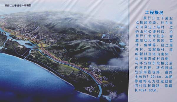 琅岐环岛路东段(三期)接环岛路二期,经围垦区西侧到云龙村南面再折向西南,由鼓尾山北面谷地穿过,折西接雁行江主干道,全长6147米。道路标准宽度70米(含两侧各5米绿化带),双向六车道,总投资8.94亿元。