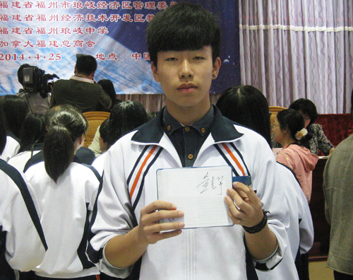 陈美铃同学手捧黄教授签名过的笔记本说:“我好高兴,好激动!,我一定要不断磨砺自己,成长成才。”她把黄教授说的“敢于有梦、勇于追梦”八个字端端正正地写在笔记本里。