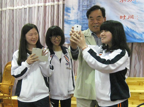 黄教授兴高采烈地与同学手机自拍留影