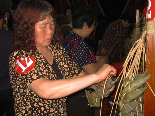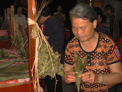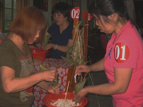 30余名参赛选手由各村委会推荐,有60多岁的老大妈,也有年轻的小姑娘。他们都是包粽子的能手,但是对于比赛感到既陌生又兴奋。比赛开始了,在规定的15分钟时间内,以粽子的数量和质量优胜评选出第一、二、三名。参赛选手们个个神情专注,拿粽叶、装米、包裹、捆扎,步骤动作有条不紊,现场十分热烈。经过评委评判,有四位选手获奖,他们在15分钟里包粽子都在30粒以上,最多的39粒。