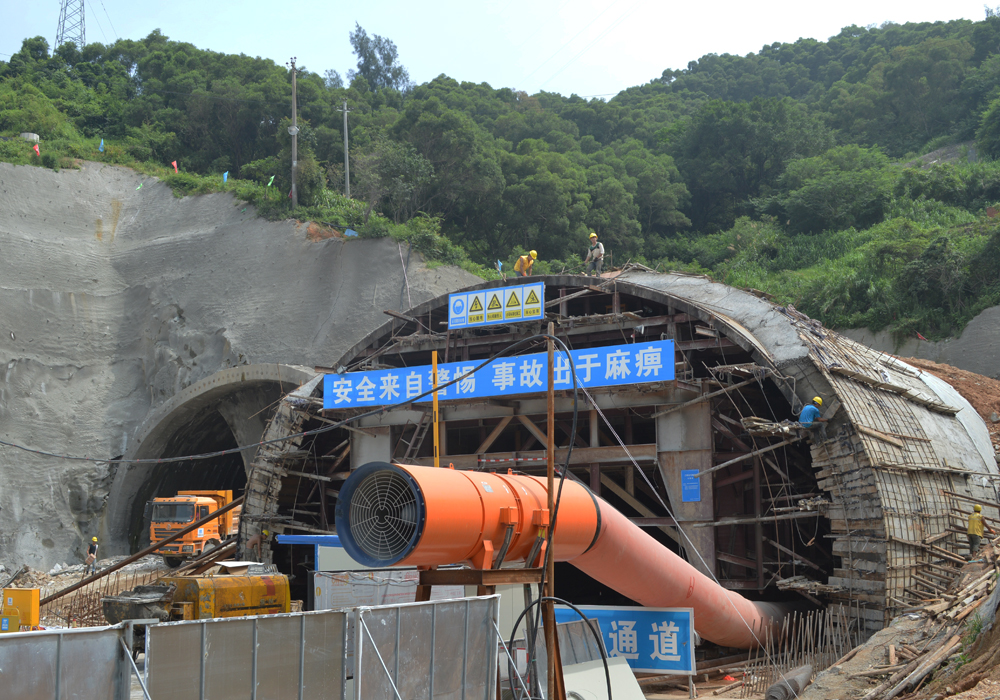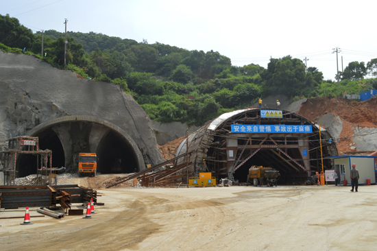 在环岛路二期工程工地,到处是热火朝天的建设景象。在凤窝岭隧道(进口)工地,机械声轰鸣,车辆进进出出运送隧道开凿的碎石;直径1米多宽的风机管道从洞内伸至洞外,呼呼作响;洞口二衬台车上方,十几个工人正进行水泥土建作业;由于施工安保严格,非施工人员严禁进入,笔者只能在洞口张望,只见洞内闪烁着灯光,工人在来回穿梭忙碌。一位现场施工负责人告诉笔者,隧道长585米,已经开挖320多米,今年底将贯通。