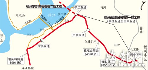 福州东部快速通道是“104国道连江至晋安段改线工程”的一段。昨日,业主单位——福州市交建集团“104国道连江至晋安段改线工程”建设指挥部总指挥陈永锋介绍,该项目的“工可报告”及初步设计文件均已获批,项目林地、土地报批工作已全面展开,施工单位已进场进行隧道开挖前的各项准备工作。