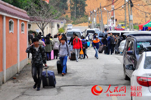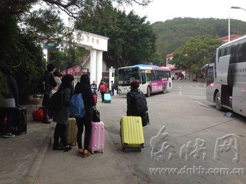 昨天上午,东南快报(微博)(微博)记者来到位于福州市琅岐镇的福建农林大学东方学院,此时,学校门口停了三四辆客车,许多学生拉着行李箱在候车。