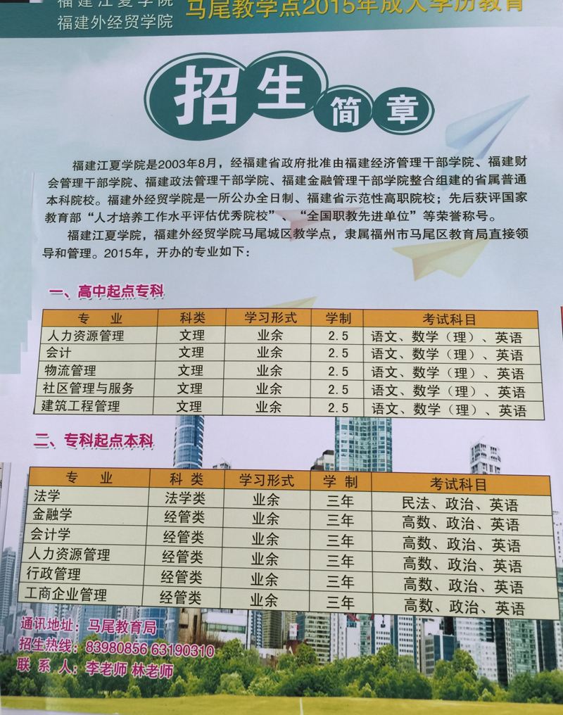 福建江夏学院2015年成人教育招生工作正式开始,各管理区、村干部群众有意报名者,请携带本人身份证复印件,以及报考专业等个人信息材料,到镇政府文化服务中心登记。