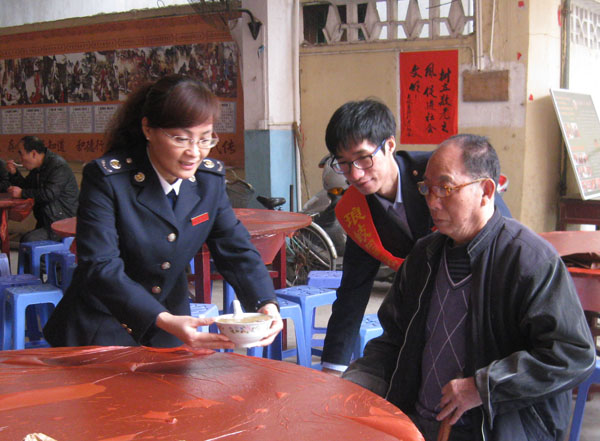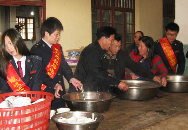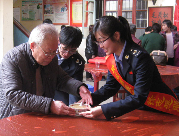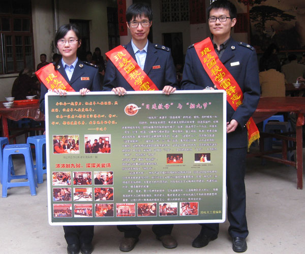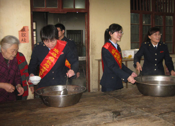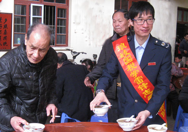 今天,“拗九节”庆祝活动在琅岐镇星辉村拉开序幕,琅岐国税局、地税局部分干部,披挂着“学雷锋志愿者”的红绶带参加了活动, 他们带来了糯米、红糖、花生、红枣、桂圆等食材煮成香喷喷的甜粥, 然后一碗碗捧到老年村民手中, 一片欢声笑语,场面温情、感人。