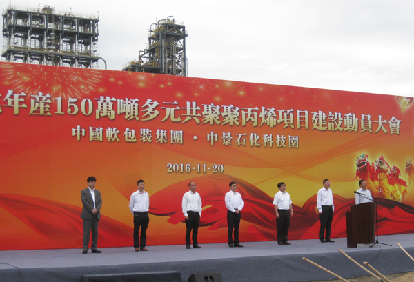 11月20日上午,中国软包装集团中景石化多元共聚聚丙烯项目,于福清市江阴工业集中区中景石化科技园正式启动建设。市领导尤猛军、王进足、阮孝应,中国软包装集团董事局主席翁声锦、中国化学集团华陆工程公司董事长吴银龙出席项目建设动员大会。
