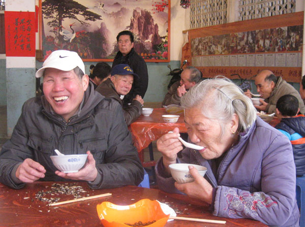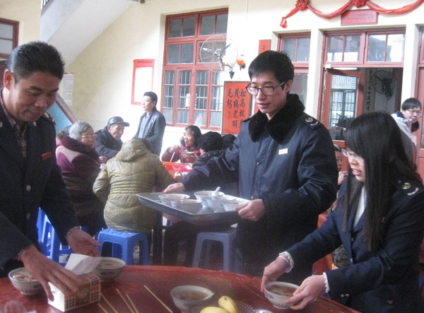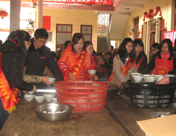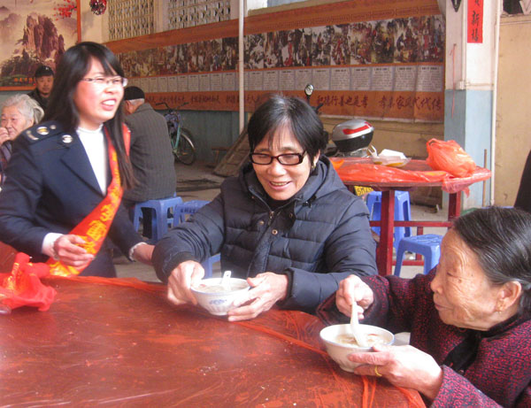 志愿者将熬制好的甜粥,捧送给现场参与活动的老人,祝福老人们平安、康泰,他们还为行动不便及孤寡老人上门送去拗九粥,帮助打扫卫生,关心他们的身心健康。