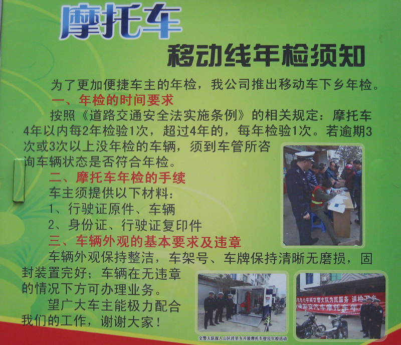 依照《道路交通安全法实施条例》,摩托车必须按规定进行年检,福州公安局琅岐分局为方便琅岐群众,特提供年检下乡服务,调配移动线年检车在琅岐公安分局治安大队部(琅岐国土资源分局后面)进行车检,4月17日已经有序年检一百多辆,但尚有部分车主未及时到场检验,现特通知未车检的车主,请几天内到琅岐公安分局登记预约,公安分局将另安排时间组织一次车检。