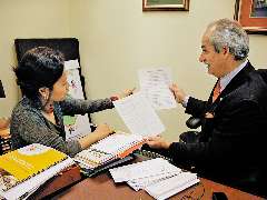紐約市移民服務局長李納瑞(右)與政策研究主任陳香怡比較該行政令中英版本。(