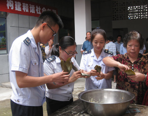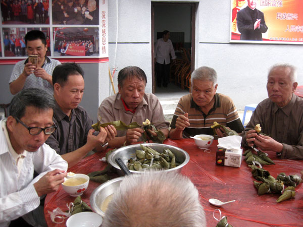 品尝香鲜粽子,村民们围坐在大园桌,谈笑风生;老年人更是笑得合不上嘴,啧啧直赞叹这活动好。爱心志愿者还上门为老弱病残群众赠送粽子,整个村庄呈现和睦安乐的气氛。