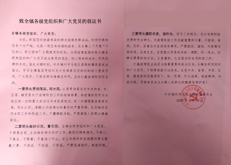 当前,新型冠状病毒感染的肺炎疫情来势汹汹,防控形势和任务十分严峻,这是一场没有硝烟的战争。在全镇上下开展“不忘初心牢记使命”主题教育的时刻,这场疫情直接检验全镇各级党组织和广大党员政治素质的底色、初心使命的成色、作风纪律的本色。值此关键时刻,中共福州市马尾区委琅岐镇党委发出倡议,号召全镇基层党组织充分发挥基层党组织的战斗堡垒作用,广大党员、干部发挥先锋模范作用,坚决打赢疫情防控阻击战。