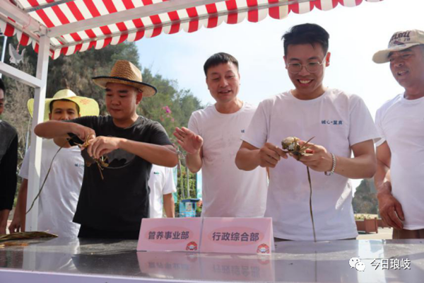 参加竞赛的12支队伍是由琅岐城投各部门及下属公司组成,并特邀经济区相关部门参加。众所周知,红蟳有着两支强有力的前螯,如果不慎被夹住,那滋味可不好受,捆蟳其实就是捆这两支大螯,竞赛队伍大部分选手只是吃过红蟳,但没捆过红蟳,这也映衬了活动的主题,对于选手们来说这是一场非比寻常的竞赛,也是一次勇敢面对新事物的挑战。此次竞赛设有“捆蟳竞速赛”、“蟳王蟳后接力赛”两项趣味竞赛环节,赛前,经济区总工会副主席江典漭、城投公司总经理朱敏分别作开场讲话,比赛全程秉承公平、公正、公开的原则,着重强调安全第一、避险为先。