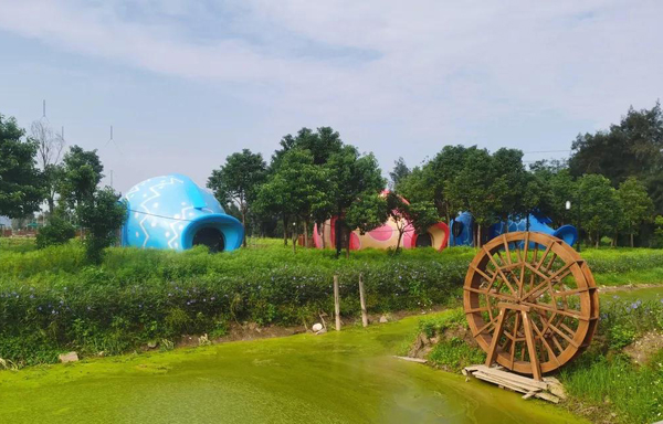 伫立田间的乡村会客厅还设有秋妈厨房、农特产品店。一旁在建的亲子民宿中,有四只张着大嘴的金鱼屋对着池塘,“吐出”一个可以泡茶垂钓的休闲平台。