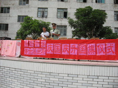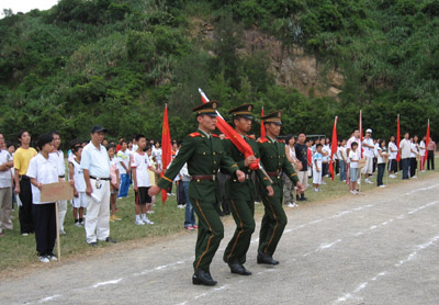 上午七点整,晴空万里,旭日东升。边防官兵与海云中学的同学们迈着整齐的步伐进入会场。庆祝祖国58周年华诞的升旗仪式正式开始了,在海云中学校校领导的主持下, 学校全体师生和边防官兵肃立在大操场,在雄壮的国歌声中,人们目视鲜艳的五星红旗冉冉升起。