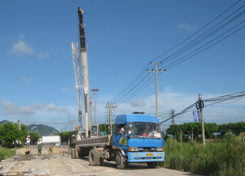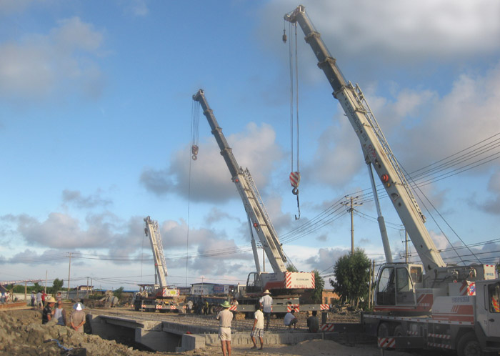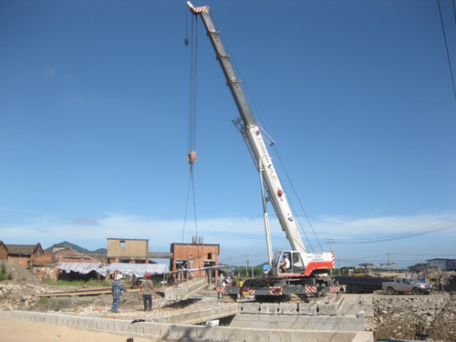 担任这次梁体架设任务的是福建华宇吊装公司,有三台大型吊车进行作业,经过一天的紧张施工,将24块,每块长13米、宽1.2米、厚0.85 米、重约20吨 的预制梁,全部架设在桥梁承台上了。