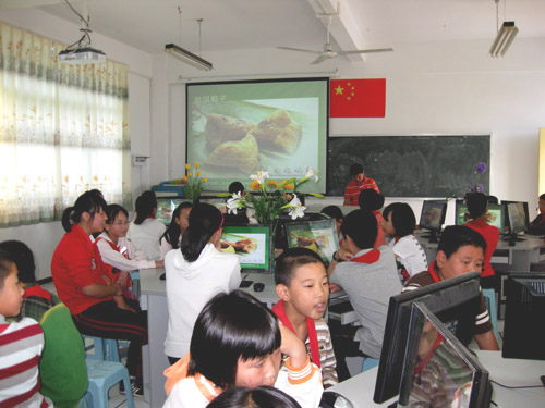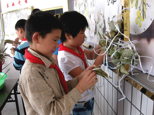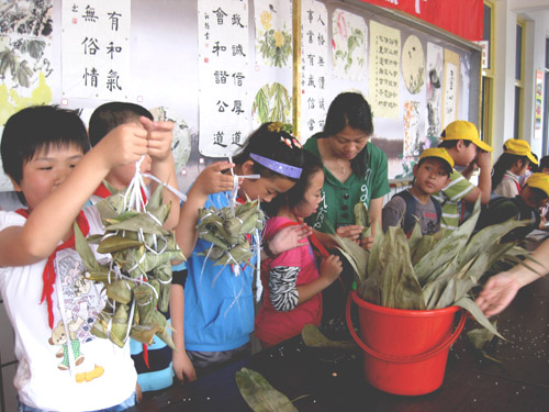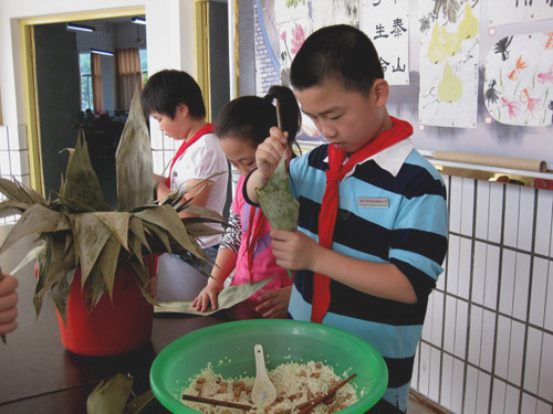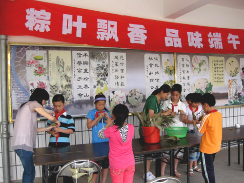 品尝端午 活动,学生饶有兴致地学习包粽子,品尝自己包的粽子,并且利用电脑课,让学生在电脑上