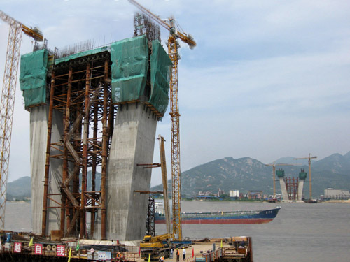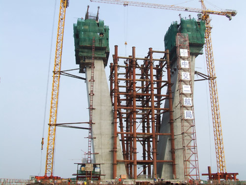 截至4月24日,3号主塔的上、下游塔柱均完成了第12节段混凝土浇筑(累计高度54米)。同时主桥边辅墩(0#、1#、2#)施工也在紧张进行,1#墩完成了近20米塔身混凝土浇筑,2#墩承台已经完成浇筑,0#墩正在进行承台施工。至于大桥引桥部分,暂未动工,待地方征地拆迁工作有了新进展,即可进场开钻。