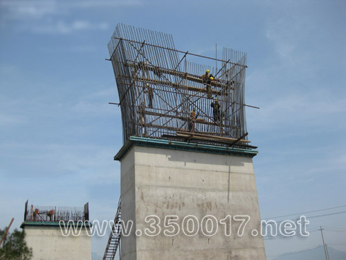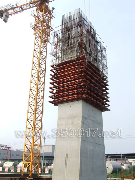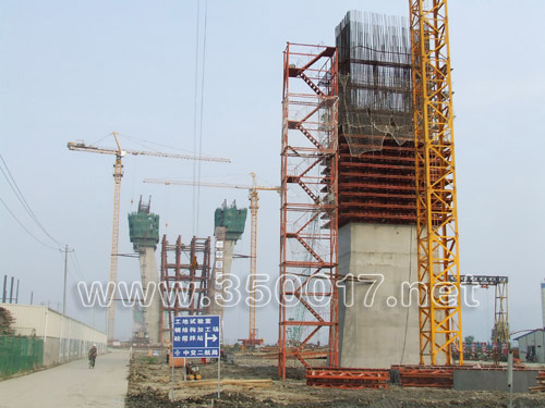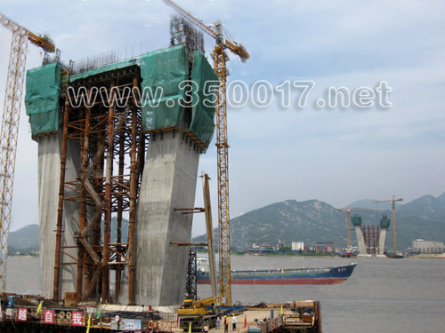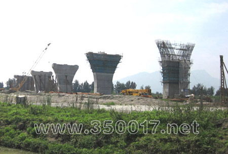 亭江一侧的主桥边辅墩1号墩已建20米高,2号墩、3号墩也节节上升 (周海川 摄影报道)