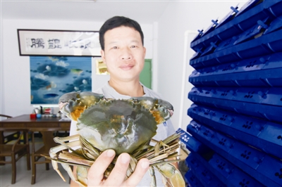 琅岐的养蟹人江爱坚随手从“螃蟹公寓”里拎出一只约有一斤重的大螃蟹,指着它背上烙刻的字样“琅岐 鲲腾合作社 GM”告诉记者,“这就是我们的产品,品质保证,可追溯。”