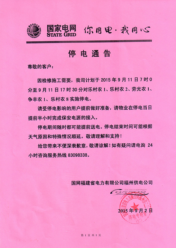 因检修施工需要,我司计划于2015年9月11日7时0分至9月11日17时30分对乐村农1•乐村农2•劳光农1•争丰农1•乐村农8实施停电.。