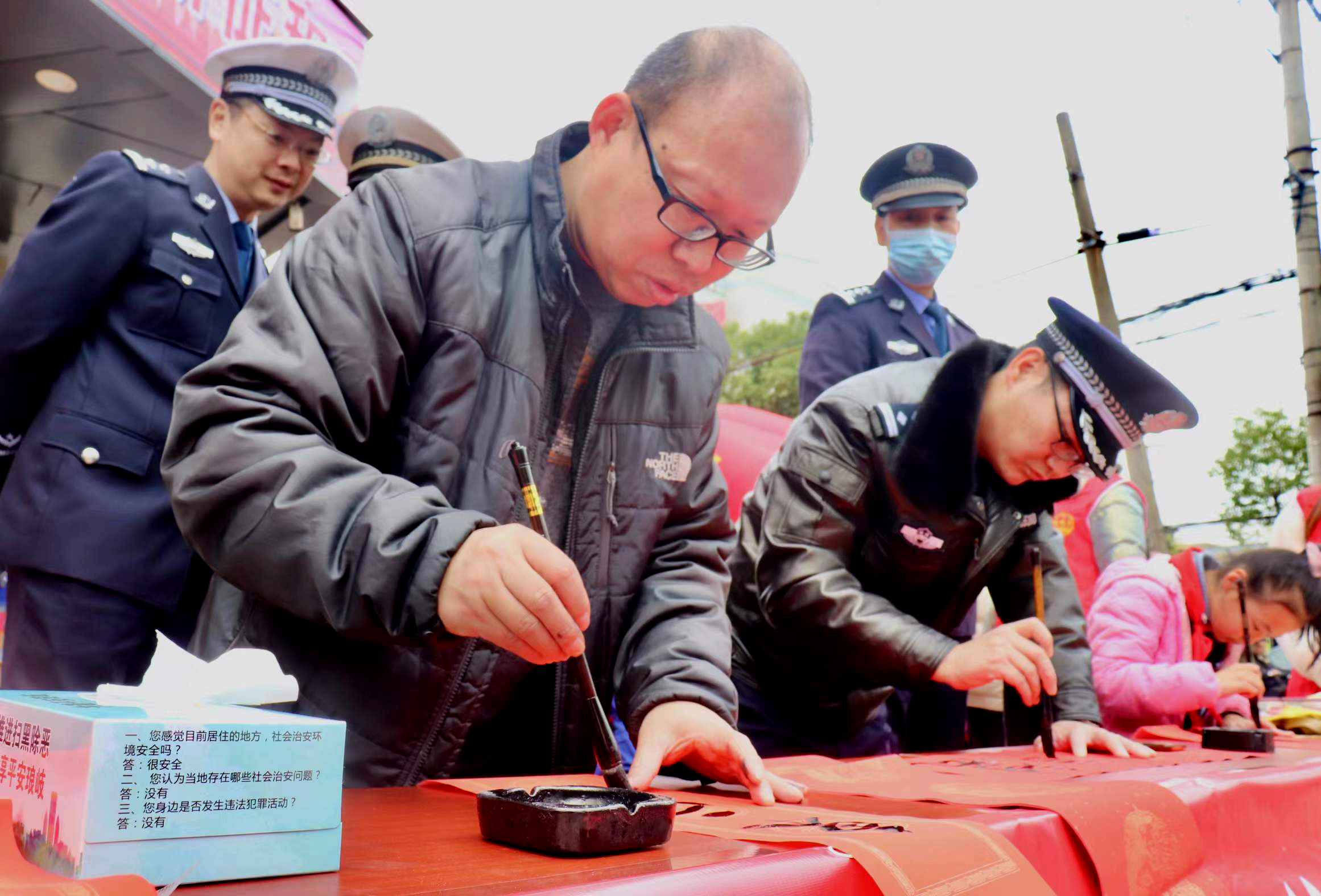 记者在现场看到,活动现场人头攒动,居民们把10余名小小书法家和民警团团围住,只见他们把墨水调匀后,大红宣纸哗啦甩开,摆好阵势后,有条不紊地沾墨、挥毫,或遒劲有力、或行云流水、或鸾翔凤翥,或龙跃天门,一幅幅笔墨酣畅的春联就写好了。